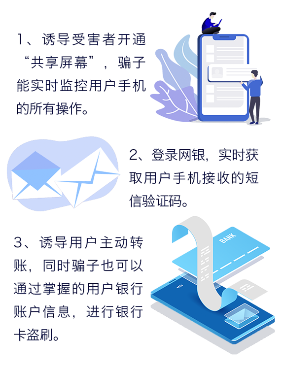 骗子往往冒充“公、检、法”或注销校园贷款的银行工作人员、平台客服人员等,诱导受害者使用网络视频会议软件内的“共享屏幕”功能。