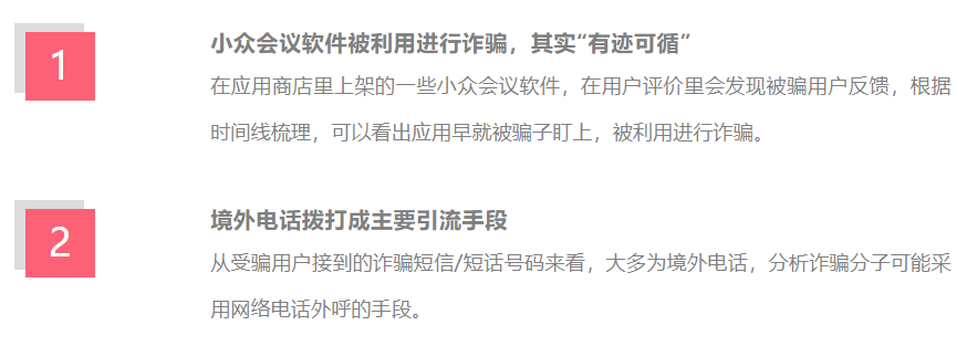 近期,针对利用小众会议软件诈骗的场景进行了深入研究,发现两点明显特征: