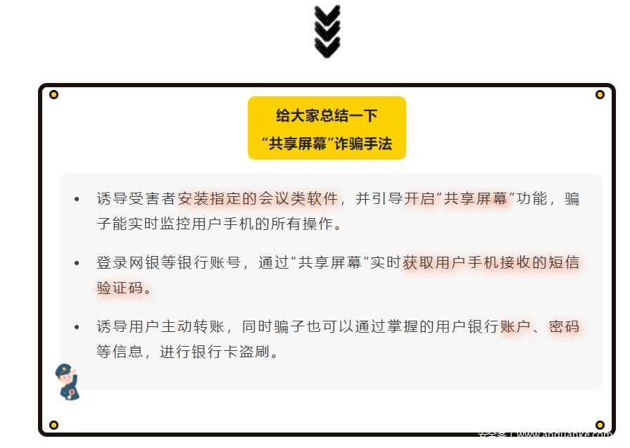 目前,越来越多的诈骗场景借助会议类APP实施诈骗,例如冒充快递/电商、冒充公检法、裸聊敲诈、杀猪盘、注销贷款等诈骗。“共享屏幕”相当于手机的录屏操作,它会把屏幕上显示的内容实时同步给对方,包括验证码等弹窗短信、微信消息、其他App推送的内容。用户一旦开启“共享屏幕”,手机输入的账号、密码以及接收的短信验证码都会被对方一览无余。这类诈骗中受害用户往往毫无察觉,悄无声息的被隔空盗刷,让人防不胜防。