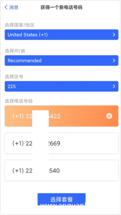 W应用是一款网络电话APP,使用手机号+短信/语音验证或邮箱账号完成注册后,如下图展示,即可按照国家、省份/州、区号等筛选条件,购买不同国家的电话号码,在服务有效期内,使用W软件拨打、接听电话。