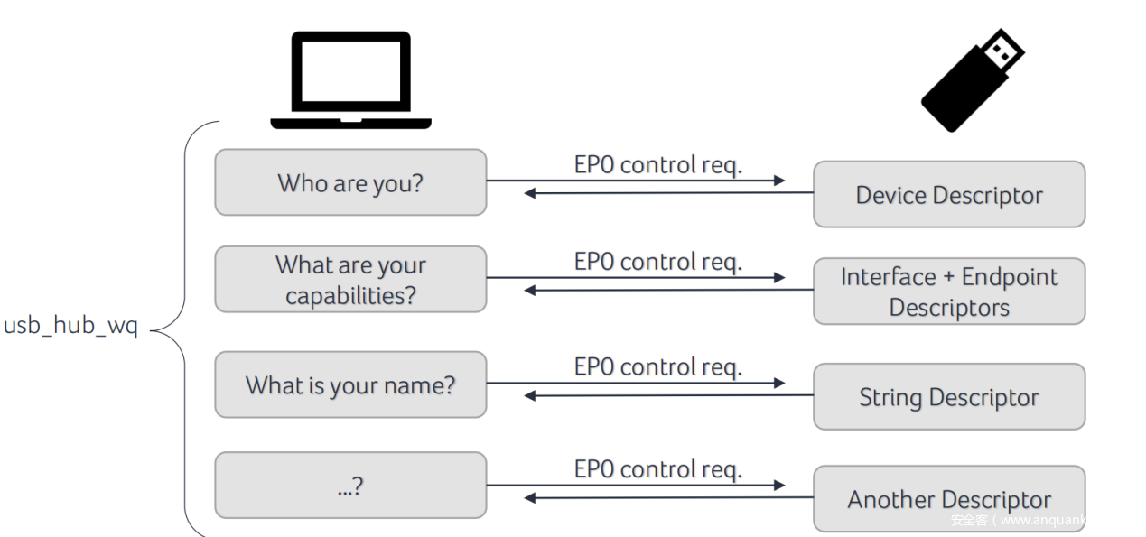 当U盘插入电脑后,固件区域的代码便开始运行,固件区域的代码主要为USB协议栈代码,这些代码用来响应主机端(HOST端)发起的各种请求,请求包括查看设备信息、设备容量、读写文件等。如下图1.2所示,U盘接入电脑后,电脑主机会向U盘发起一些请求,U盘的固件代码会对这些请求做出响应。
