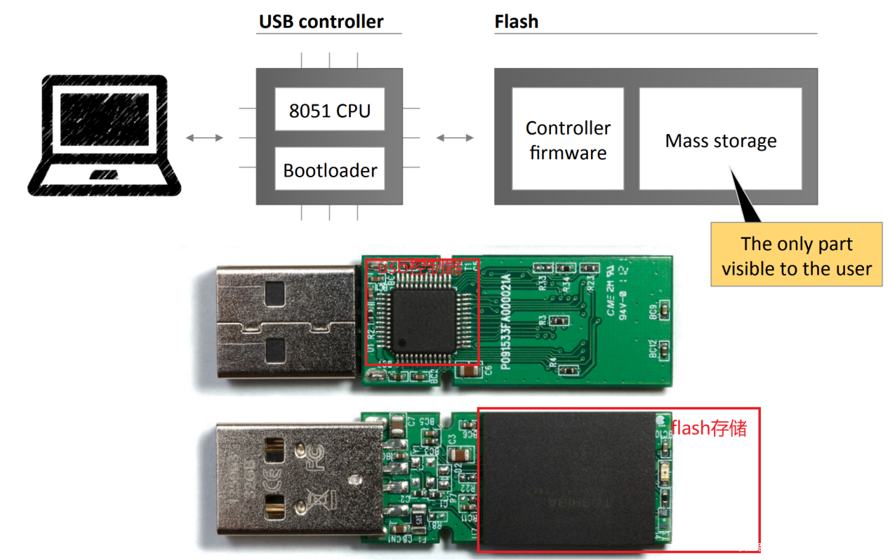一个U盘主要由主控板(USB控制器)、FLASH存储等组成。FLASH分为2部分,一部分是用户可见的存储区,另一部分是用户不可见的固件区域。