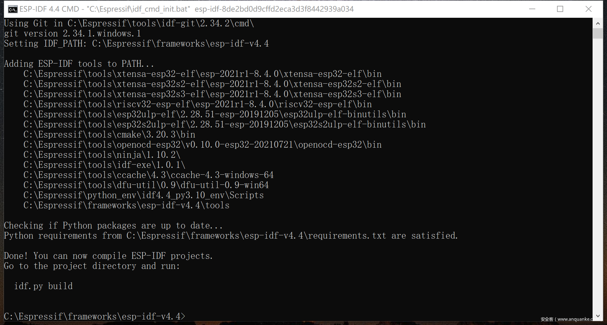 安装成功之后,会在桌面生成ESP-IDF X.X CMD快捷方式,双击快捷方式如果显示如下命令行窗口,代表交叉编译环境安装成功了。