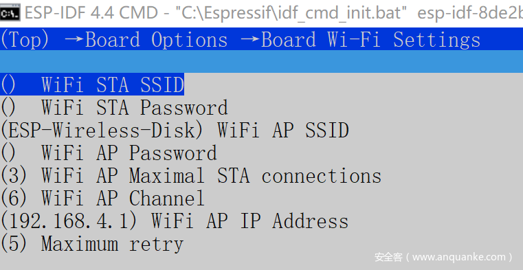 idf.py menuconfig// 配置一些选项,例如,使用内部flash还是外部sdcard,wifi的类型,AP/STA。
