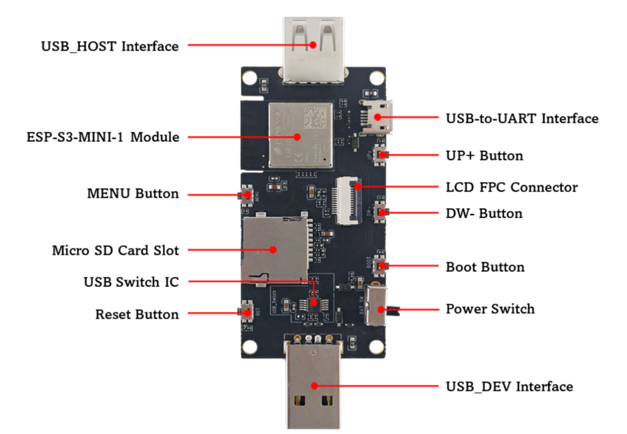 该开发板中需要关注的有USB_DEV,USB-to-UART,Micro SD Card,ESP-S3-MINI-1。USB_DEV interface是一个TYPEA公口,可以连接其它USB主机,ESP-S3-MINI-1模组是通用型Wi-Fi MCU模组,具有丰富的外设接口,内部包含了ESP32S3芯片。Micro SD Card Slot可以插入TF卡,ESP32S3芯片通过4-线 SDIO和SPI接口读写TF卡里的内容。USB-to-UART接口是Micro-USB接口,可用作开发板的供电接口,可烧录固件至芯片,也可作为通信接口,通过板载USB转UART桥接器与芯片通信。