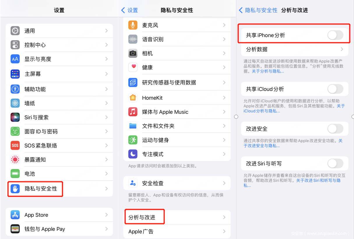 关闭路径:【设置】-【隐私】-【分析与改进】,将【共享iPhone分析】进行关闭即可。