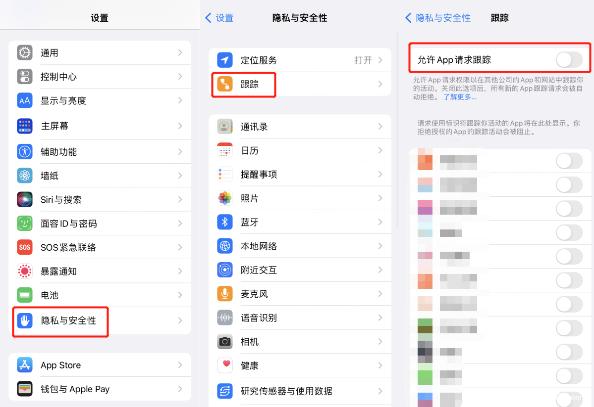 关闭路径:【设置】-【隐私】-【跟踪】,将【允许App请求跟踪】关闭,可防止收到应用的定向广告。