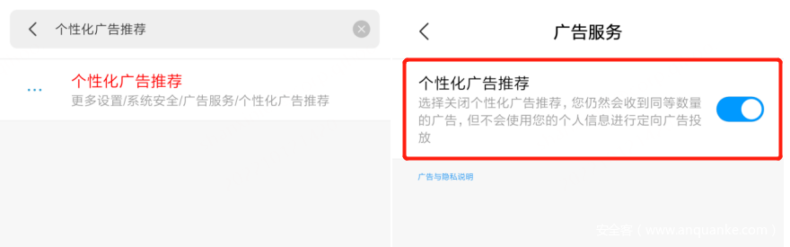关闭路径:打开手机【设置】,搜索“个性化广告推荐”,一定程度可以减少被精准推荐广告的可能。
