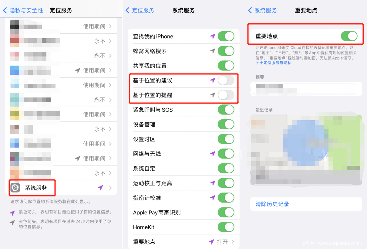 关闭路径:【设置】-【隐私】-【定位服务】,拉到最底部的【系统服务】,关闭【基于位置的建议】、【基于位置的提醒】、【重要地点】这三项都建议关闭,避免重要位置信息被分析和泄露。