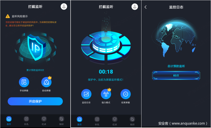 根据用户的使用反馈,我们下载安装了该款防窃听软件,重点体验“拦截监听”功能。直观体验是首页可以开启预防监听保护,非会员免费试用5分钟,高级功能体验需要充值会员几十元不等;根据功能开通时间,页面实时显示预防监听次数。