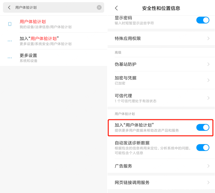 关闭路径:打开手机【设置】,搜索“用户体验计划”,按需关闭即可。