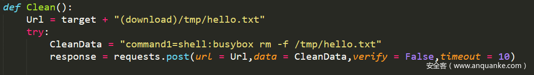 这个漏洞需要想目标机发送一个POST请求生成一个hello.txt,那么在利用完成之后就会把hello.txt留在目标机里,这样就增大了被发现入侵过了可能性,所以我这里再加一个Clean()函数对这个txt进行清理