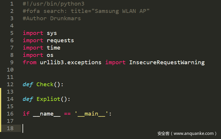 然后就是搭建一个框架,定义一个Check()函数意为检查这个漏洞是否存在,Expliot()函数意为发包去利用这个漏洞,再就是一个主函数