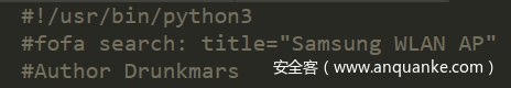 这里就注释了python3编写,以及怎么找这个漏洞的fofa语句,以及我自己的作者姓名