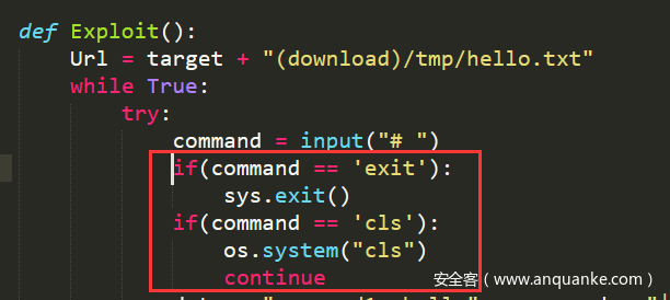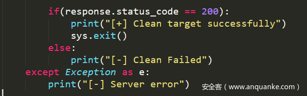 那我们继续往下来到Exploit()即漏洞利用这个模块编写,之前我们运行了Check()函数,用了一个if…else…语句对返回包进行判断,如果有200存在则返回True,那么这个地方我们首先要判断上一个函数是否返回的为True,如果不为True我们肯定就没有必要再往下执行这个Exploit()函数