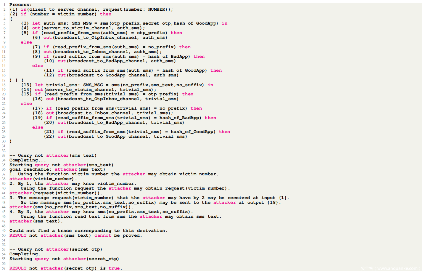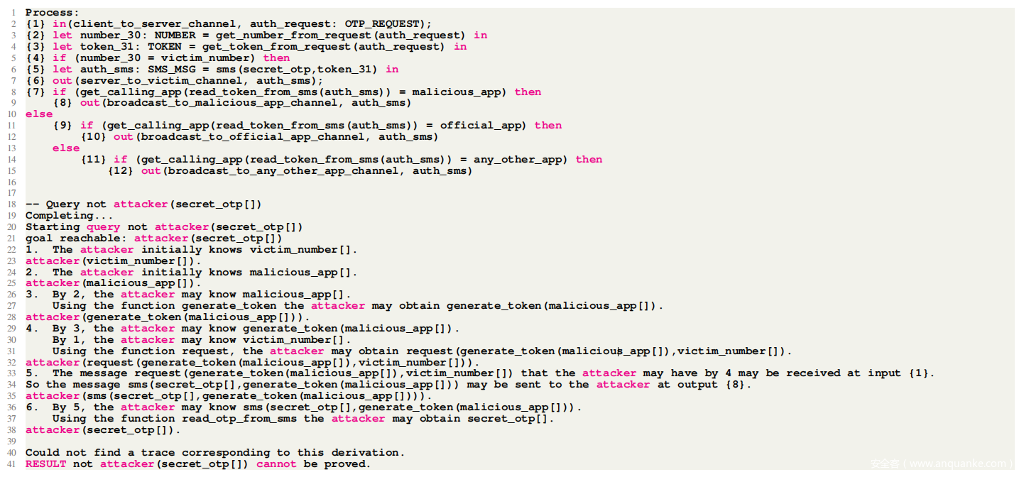 为了进一步证实本文的主张,使用ProVerif来演示SMS Token API的基本设计缺陷。 ProVerif是用于自动推理和验证给定密码或通信协议的安全属性的软件。在本例中根据上图所示,使用SMS Token API对App与相应的后端服务器之间的交互进行了建模。ProVerif能够说明攻击者如何从服务器获取OTP。证明的详细信息如下图。