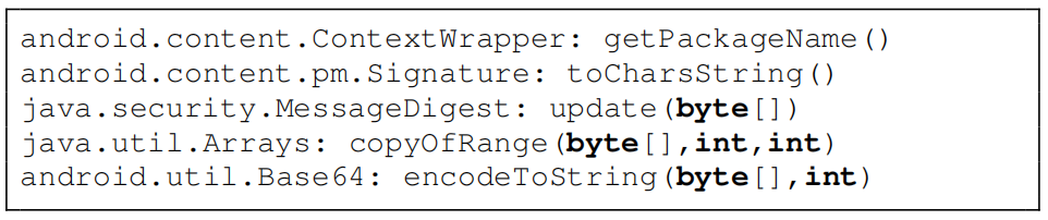 为了检测硬编码Hash码的存在,研究者自己计算了App的Hash码,然后使用字符串匹配在App的代码中找到它的存在。此外,为了检测App是否动态计算自己的Hash码,检查该App是否调用了获取自己的签名证书所需的特定API(如上图所示)以及这些API的结果如何链接在一起。最后,使用FlowDroid提供的数据流分析来检测Hash码是否确实通过网络API发送出去。