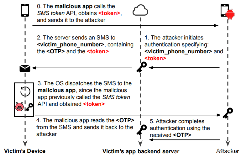 假设:对于这种类型的攻击,假定受害者App使用系统提供的API之一进行身份验证。但是不假定恶意App具有除联网(用于发送SMS OTP码)以外的任何权限,并且不假定任何用户交互。这些攻击的无许可和无交互性质使它们比以前的攻击更加令人担忧。