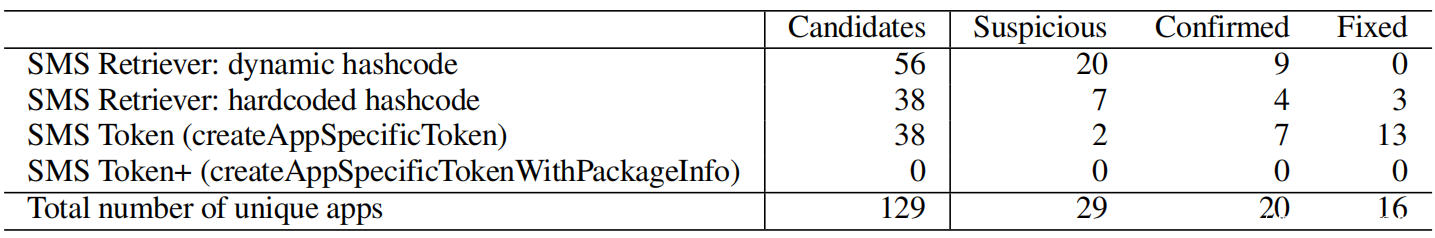 为了更好地了解App如何使用现代API进行SMS OTP身份验证,对Google Play商店中的Android应用程序进行了大规模的测量分析。结果表明,由于使用了这些API,许多受欢迎的App被确认为易受攻击。