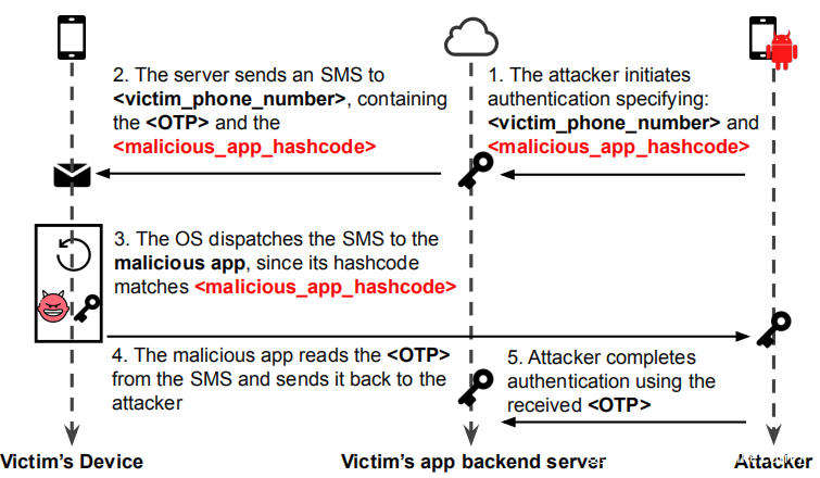 但是,如果App开发人员以不同且易受攻击的方式实施后端逻辑,则可能会不安全地使用此API。具体来说,可以实施后端,使其从App本身接收App的Hash码,然后将Hash码插入到生成的SMS OTP消息中。此时,合法App的后端将生成一条SMS OTP消息(包含恶意App的Hash码),该消息将由操作系统传递给恶意App,而不是合法的App。