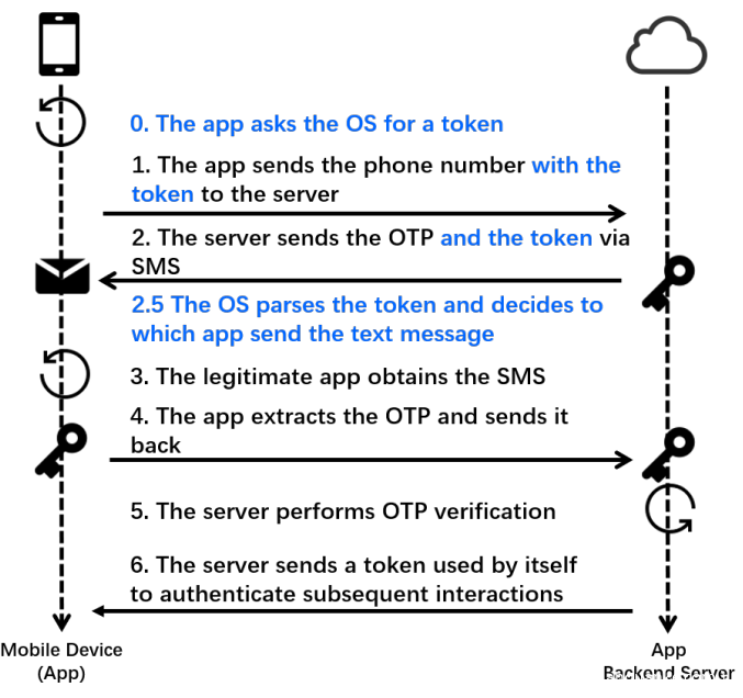 SMS Token API本质上是不安全的,无论开发人员如何使用它。要使用SMS Token API,App程序A必须调用createAppSpecificSmsToken API来获取随机Token T。然后,该App将该Token发送到其后端服务器,后者将通过发送包含然后,操作系统将检测到接收到的SMS包含Token T,然后它将消息分发给App程序A。
