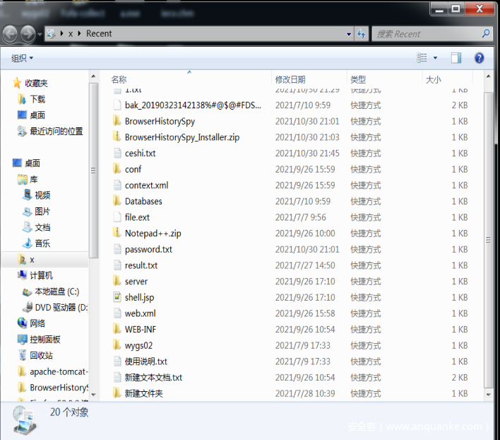 可以在目录 C:\Users\x\Recent下查看,也可以使用win+r 输入 %UserProfile%\Recent 查看