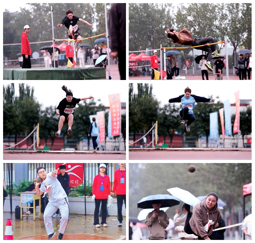 在跳远、跳高、铅球比赛中,运动员们更是展现出了惊人的毅力和技巧。他们不顾雨水打湿衣裳,一次次起跳、腾空、抛掷、落地,用汗水和努力书写着属于自己的精彩篇章。