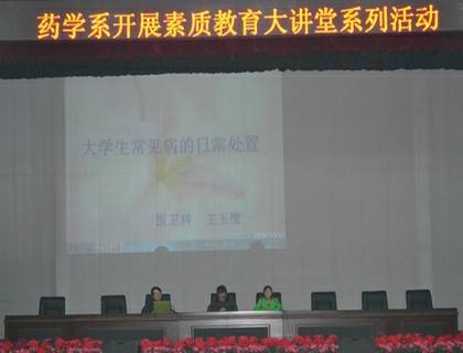 为落实山西省卫生厅、教育厅《关于进一步加强学校和托幼机构传染病防治工作的通知》的文件精神,学院医卫科科长王玉璧结合学院实际情况,分别于2012年11月7日下午和2012年12月4日晚上,为药学系和食品工程系全体学生,举办了以“大学生常见病防治”为主题的健康知识讲座。