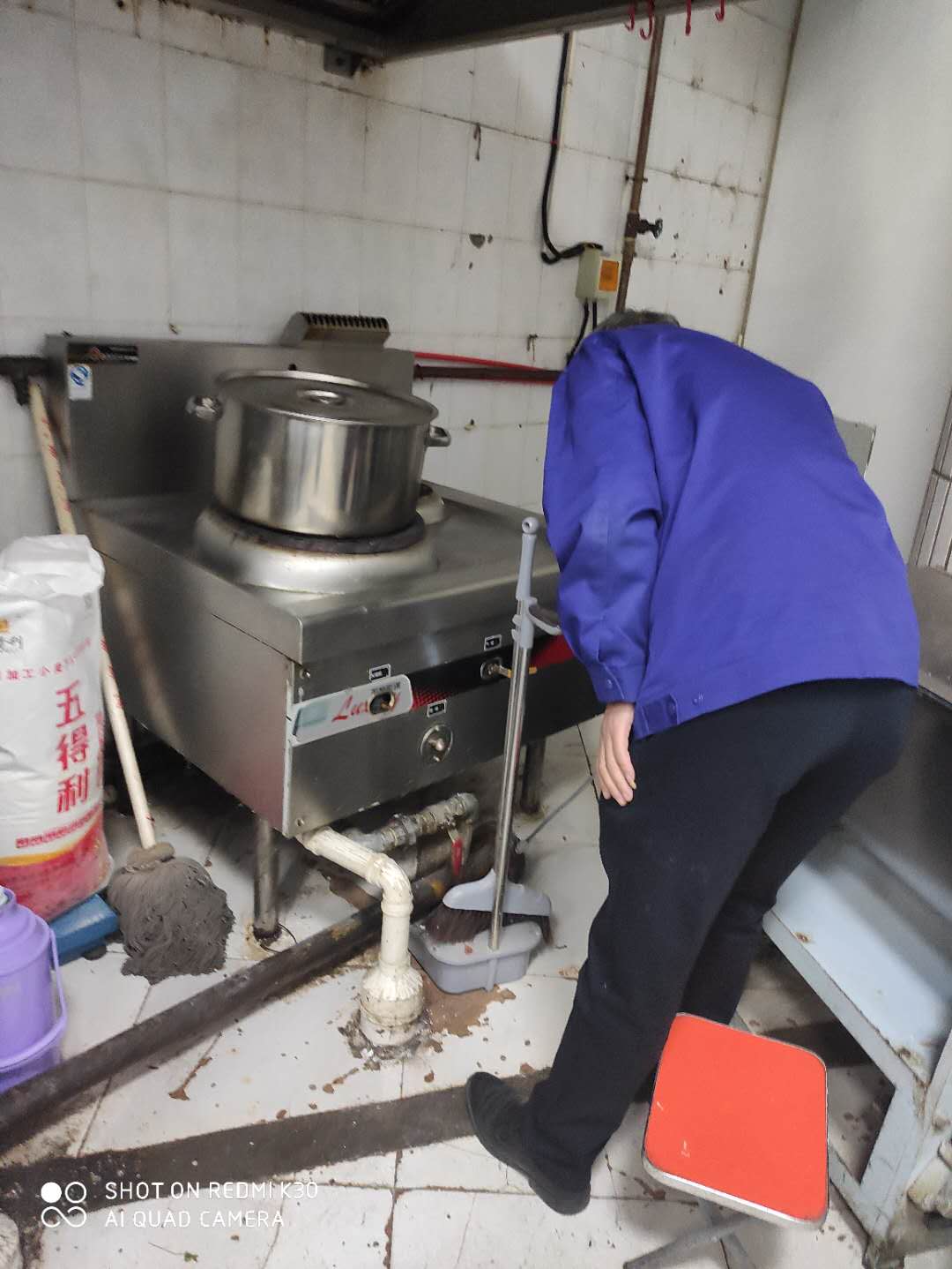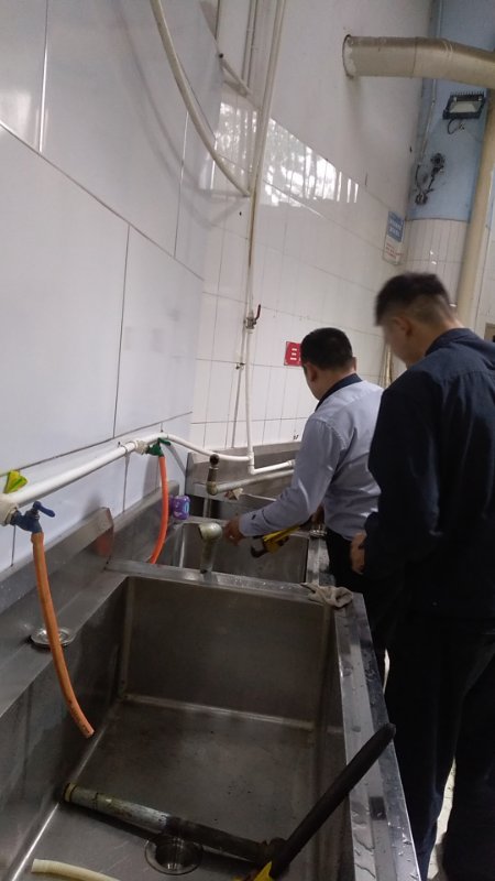 工作人员对食堂后厨灶台管路进行检查