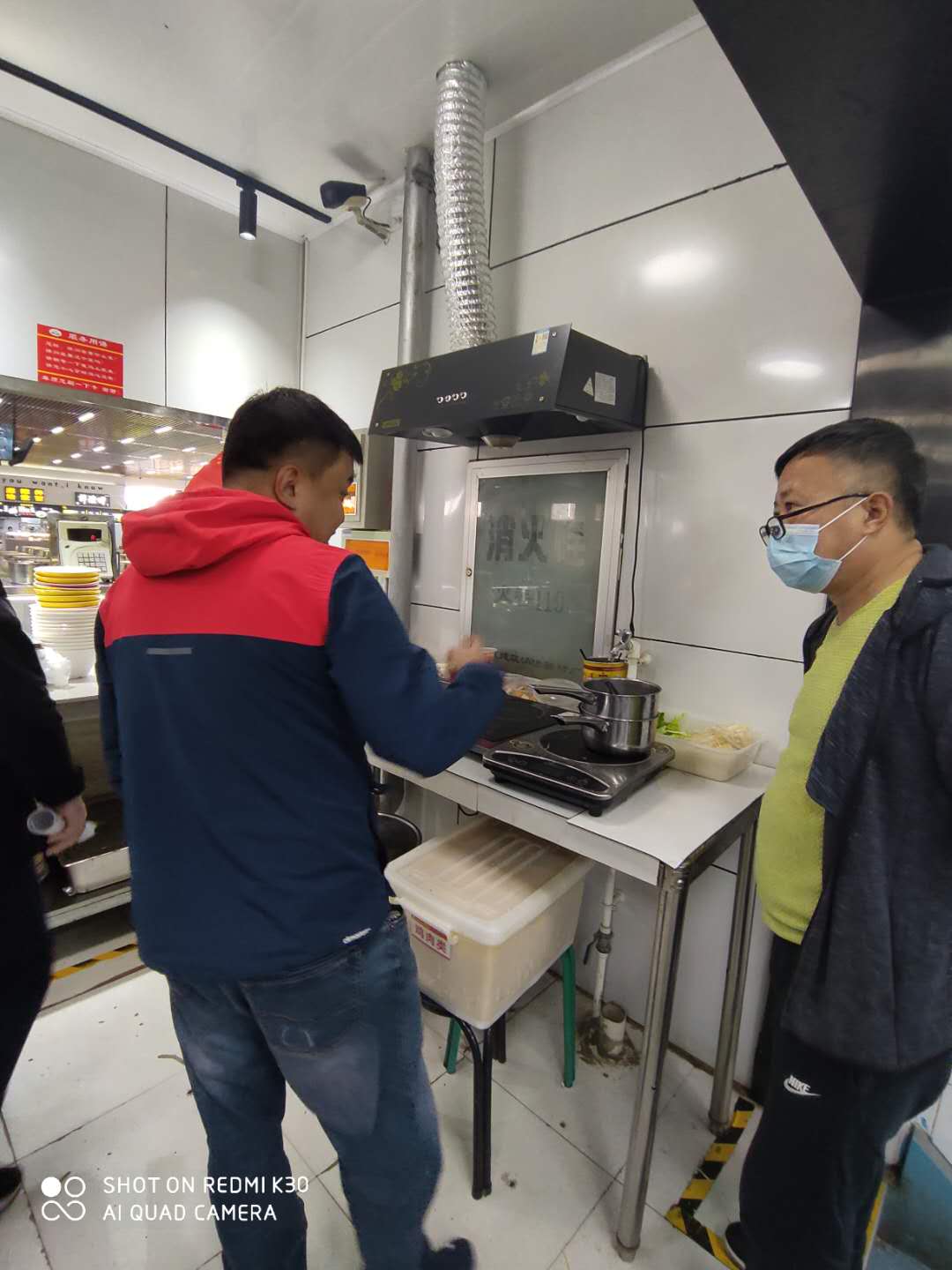 工作人员对食堂消防设施设备进行检查