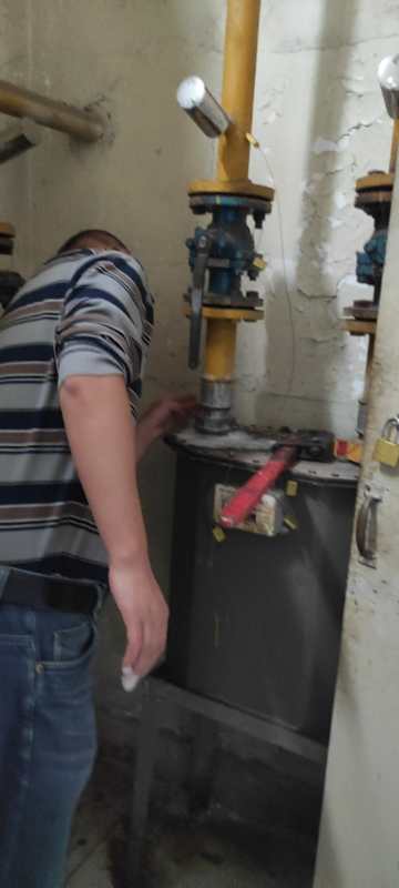 工作人员对食堂天然气管道进行巡查