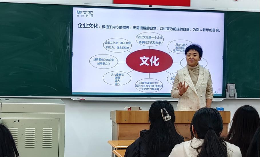 广州樊文花化妆品有限公司山西分公司靳丽娜副总经理,凭借丰富的行业经验和扎实的专业素养,为学员们带来了精彩纷呈的第一堂课。她讲解了广州樊文花化妆品有限公司的成立初心、发展历史、企业文化等,对学员们提出了殷切期望。她表示,樊文花产业学院将为学生提供专业、系统的学习平台,让学生们学习到全国领先的面部美容护理知识和技能,助力学生们成长为化妆品经营行业的优秀人才。