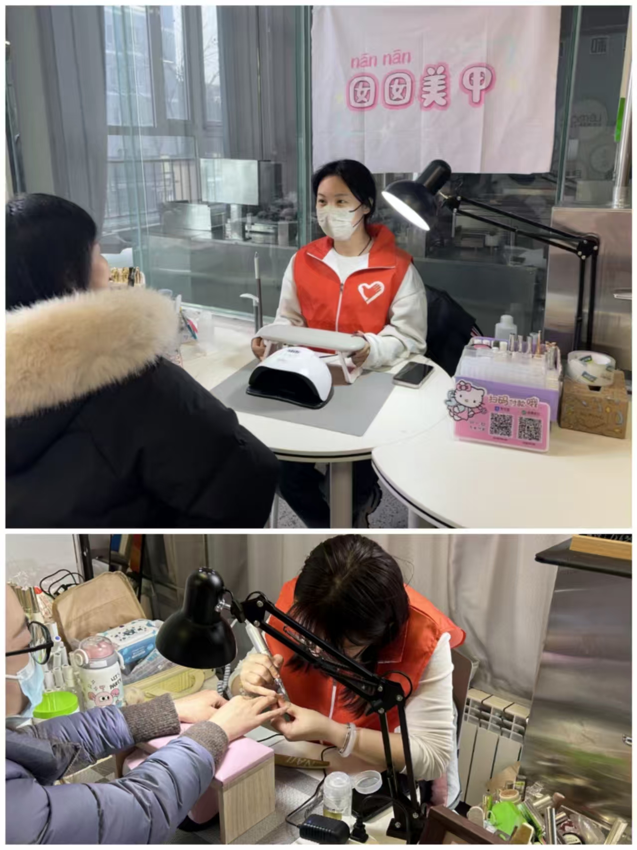 活动中,社团学生展现出了扎实的专业技能。从精心修剪指甲形状,到细致打磨甲面,再到耐心涂抹底油、上色、封层,每一个步骤都有条不紊。老师们可以选择简约的纯色美甲,展现优雅气质;也可以尝试时尚的渐变、法式等款式,增添一抹活泼与俏皮。对于手部护理,社团成员们为老师们细心地清洁双手、去角质、涂抹护手霜并进行按摩,帮助老师们缓解日常工作的手部疲劳,让双手恢复柔嫩与光泽。