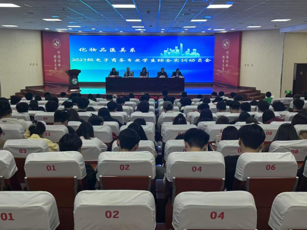 4月27日下午,化妆品医美系在综合楼报告厅隆重召开2023级电子商务专业综合实训动员会,系领导班子、教研室主任、辅导员、专业教师及全体即将参与综合实训的2023级电子商务专业学生齐聚一堂,共话成长与未来。