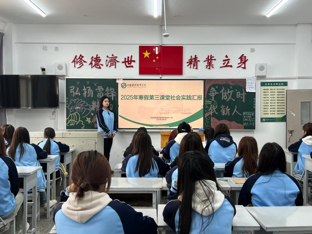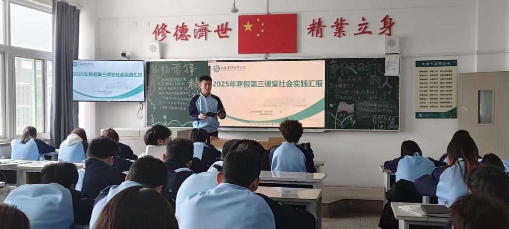 团课上,各班团支部书记总结了寒假第三课堂社会实践的总体情况,同学们通过ppt和小视频,以个人和小组的形式,围绕第三课堂实践手册、红色地图打卡、产业学院实习、返家乡实践等内容,结合自己寒假期间参加实践活动概况、内容、成果以及感悟与收获进行了汇报。各班学生通过照片、视频等形式记录了自己实践中参与理论学习、红色研学、读书打卡、志愿服务、认识实习等丰富多彩的活动。大家包饺子贴对联,在寻味非遗春节中感悟中国传统文化之美;打卡革命纪念馆,在传承红色基因中涵养道德品质;在产业学院认识实习中提升综合素质;每日打卡学练八段锦,在体育运动中强健体魄,砥砺意志;做家务、参加社区志愿服务,在劳动实践中培养劳动精神。同学们充分利用假期的宝贵时光,积极融入了家庭生活,投身到了广阔的社会实践活动中。