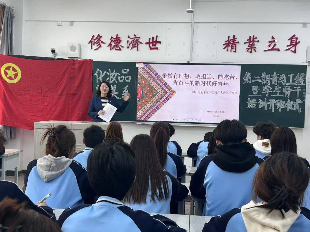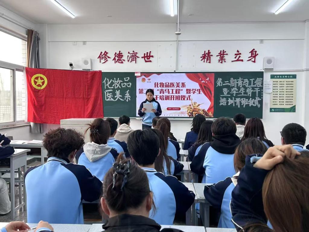 开班仪式在庄严的国歌声中拉开帷幕。学员代表许珂楠同学发言,表示在接下来的青马工程培训学习中,要严以律己,志存高远,做到“立心、立行、立德”,努力学习习近平新时代中国特色社会主义思想,做坚定的马克思主义者。系党总支副书记魏永鹏宣读《化妆品医美系第二期“青马工程”暨学生骨干能力提升培训班实施方案》,并对学员提出了纪律要求。系党总支书记范张姣在开班动员讲话中对学员提出三点希望:一要坚定理想信念,加强理论素养,做一名马克思主义的坚定拥护者;二要勤奋刻苦学习,坚持知行合一,做一名马克思主义的忠实实践者;三要争当先锋模范,甘于奉献社会,做一名马克思主义的积极传播者。开班仪式在全体奏唱《光荣啊!中国共青团》团歌中圆满结束。