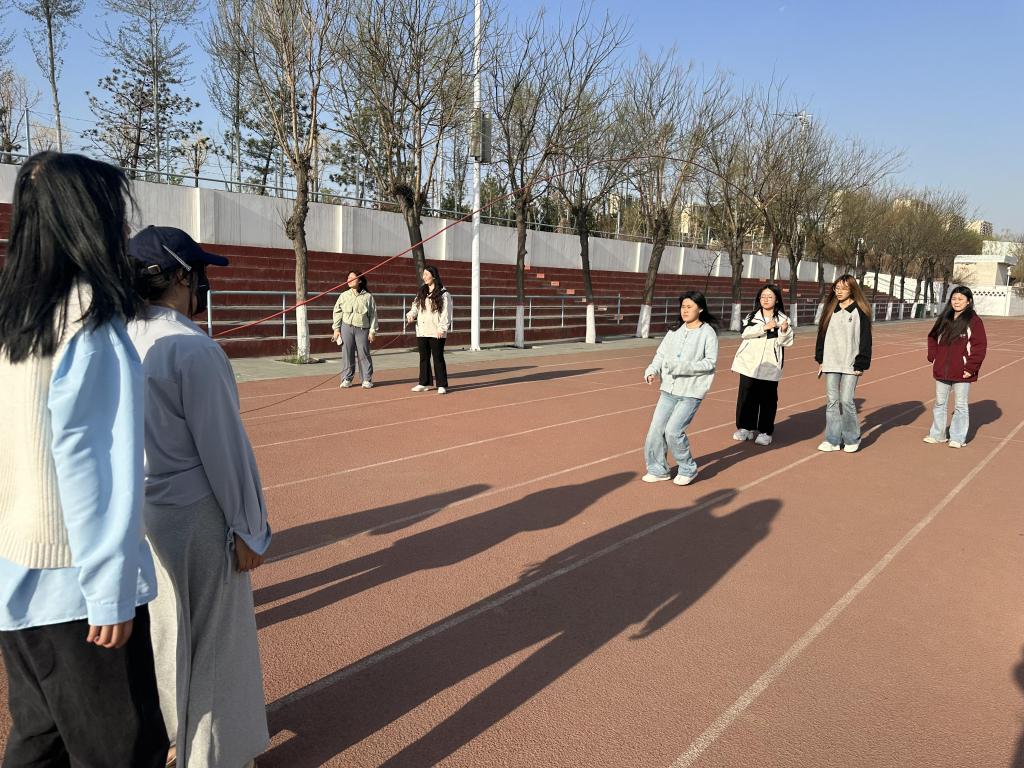 活动伊始,随着裁判一声清脆的哨响,比赛正式拉开帷幕。赛场上,各参赛队伍迅速就位,摇绳队员紧握长绳两端,双臂有力地挥动,让大绳在空中划出流畅的圆弧。跳绳队员们目光坚定,紧盯大绳起落节奏,一个接一个默契十足地鱼贯而入,在翻飞的绳影中轻盈跳跃。“一二、一二” 整齐响亮的口号声此起彼伏,他们身姿矫健,动作连贯,充分展现出高度的团队协作能力。围观的同学们热情高涨,纷纷为选手们呐喊助威,加油声、欢呼声交织在一起,将现场气氛推向一个又一个高潮。