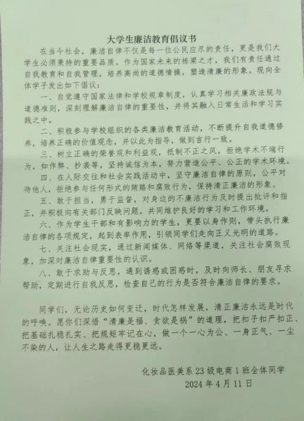 赛后,担任评委的辅导员王坤老师对本场比赛以及辩手表现进行了点评,剖析梳理辩题,复盘赛中各阶段形势,给出意见和建议。同时,王坤老师再次强调大学生廉洁教育对于个人成长的重要意义,同时,也鼓励同学们积极参与我校“清廉校园”的建设中,做到知行合一,让新时代廉洁文化在校园落地生根。最后,23级电商1班全体同学向全校学子发出大学生廉洁教育倡议。