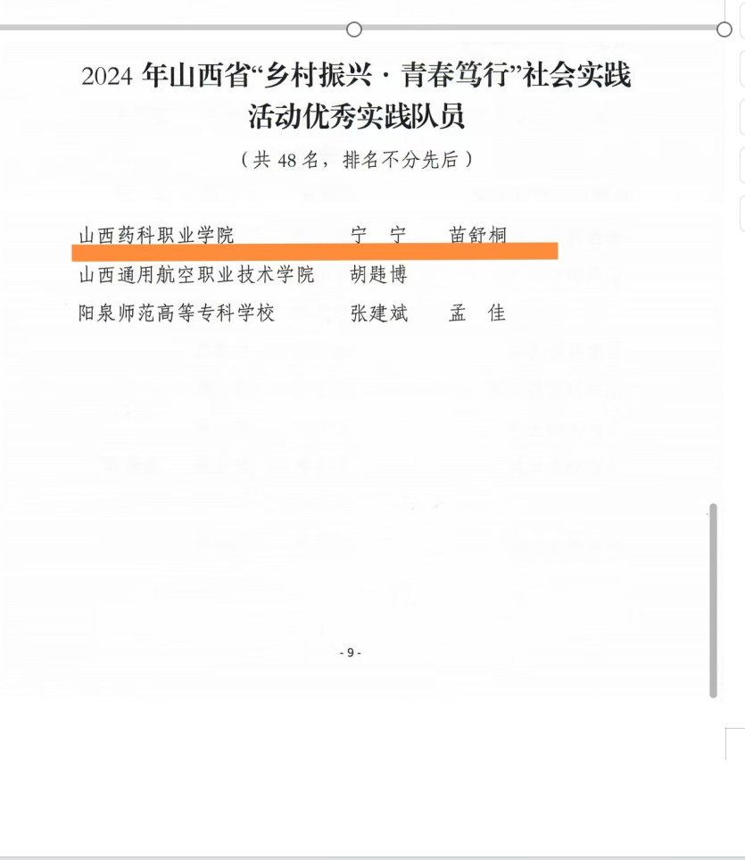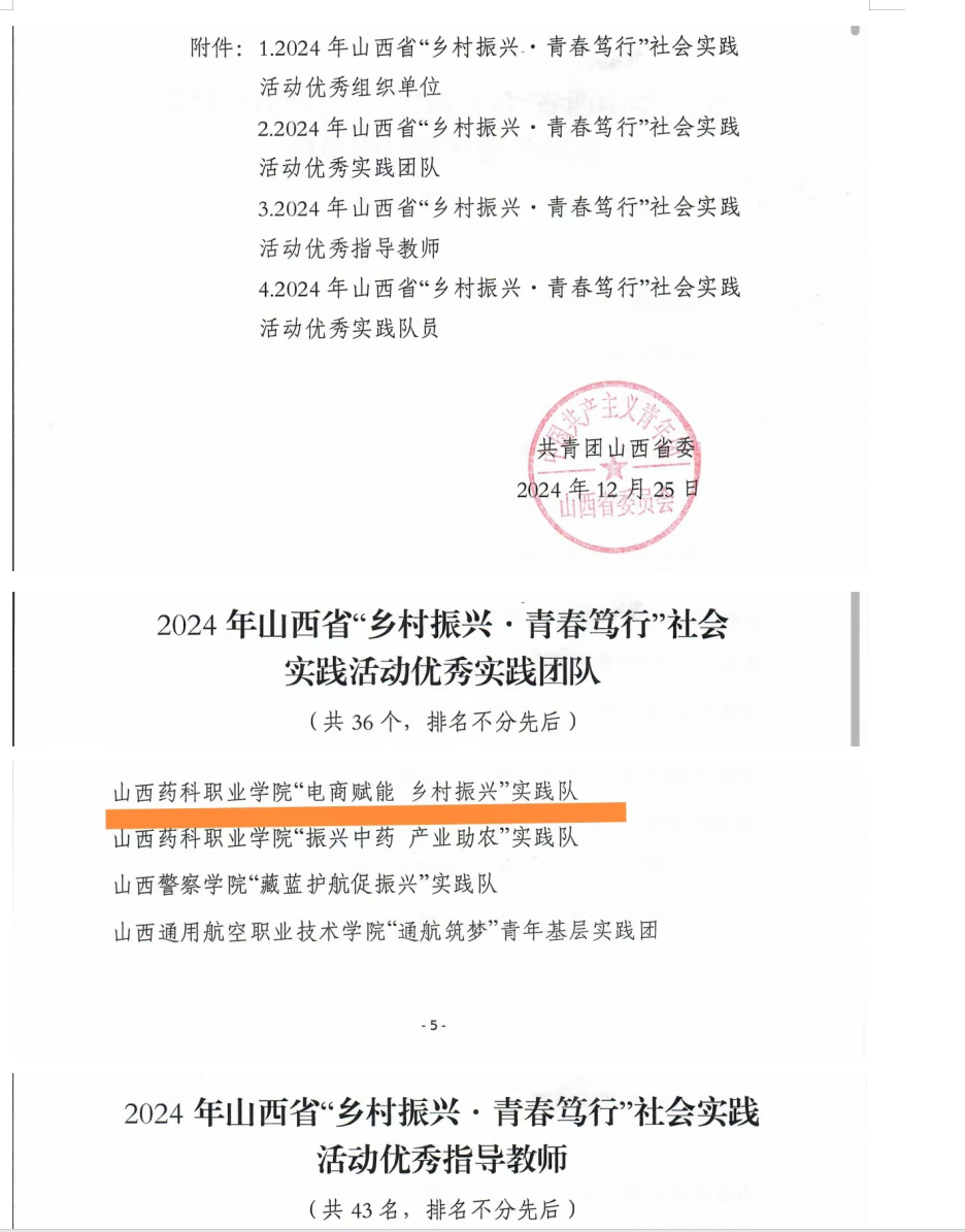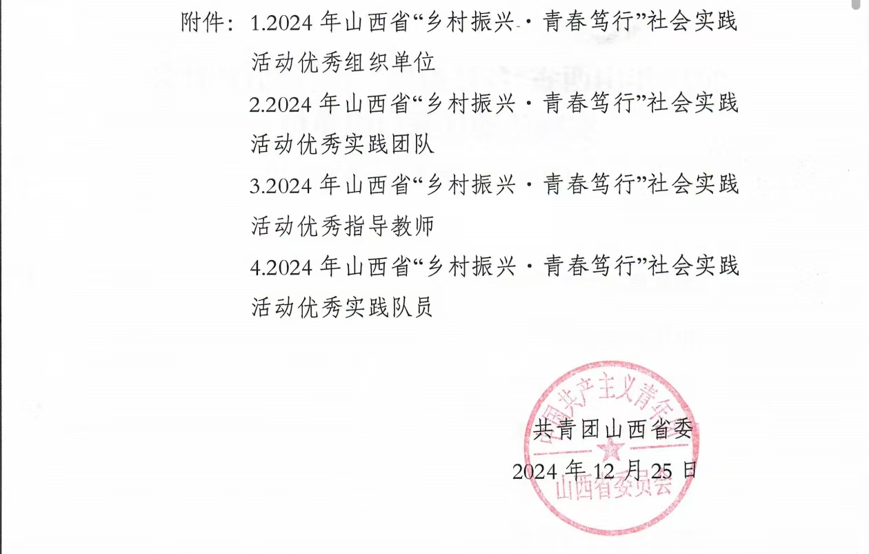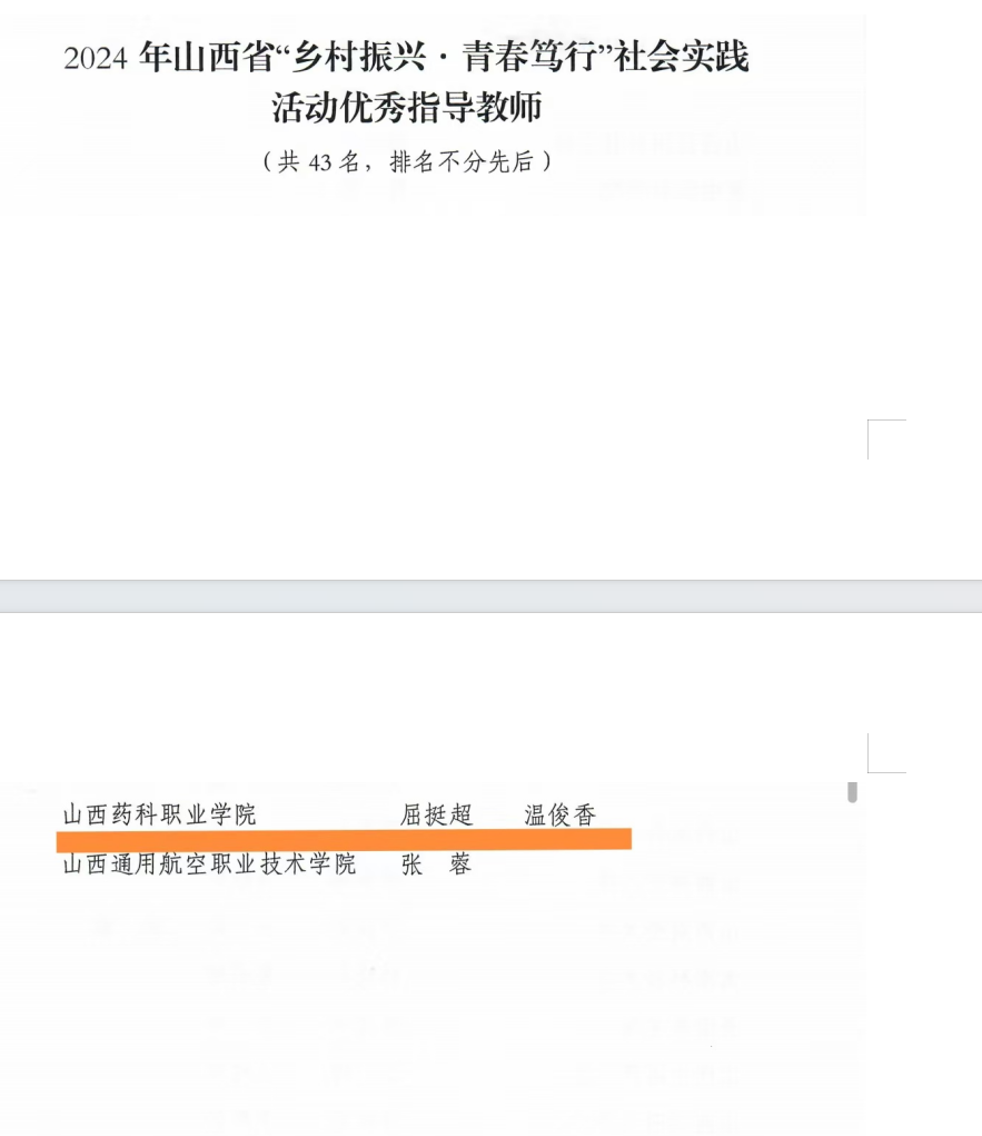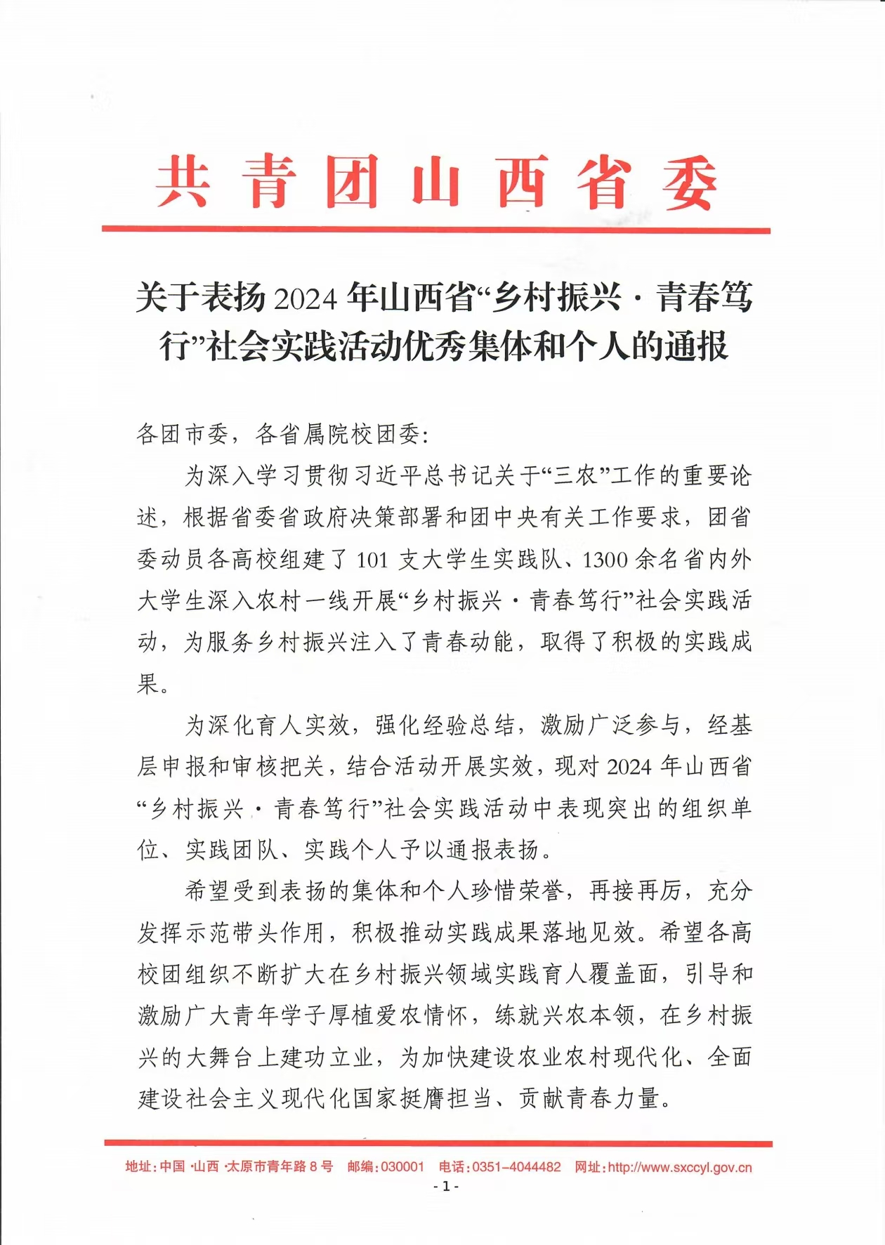 在共青团山西省委关于2024年山西省“乡村振兴·青春笃行”社会实践活动优秀集体和个人的表彰中,化妆品医美系“电商赋能,乡村振兴”社会实践队获山西省“乡村振兴·青春笃行”社会实践活动优秀实践团队;电子商务专业教研室主任温俊香获得优秀指导教师;实践队成员2023级电子商务2班学生苗舒桐获得优秀实践个人。
