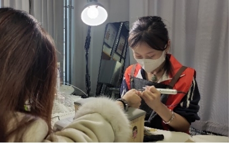 3月5日下午的活动现场温馨而热闹,美妆社团的成员们早早便做好了准备,美甲工具摆放整齐,各类甲油色彩斑斓,手护产品一应俱全。女老师们陆续来到活动场地,脸上洋溢着期待的笑容。社团成员们热情地迎接老师们,根据老师们的喜好和风格,提供专业的美甲款式推荐和手部护理建议。