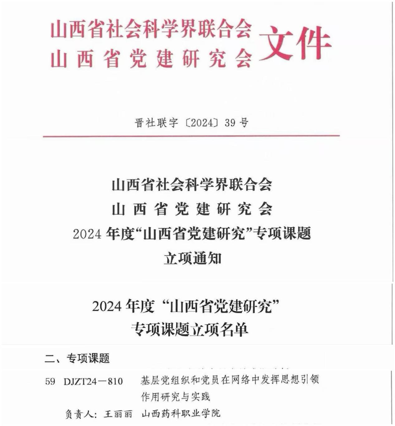 近日,山西省社会科学界联合会、山西省党建研究会公布了2024年度“山西省党建研究”专项课题立项通知,我系党总支专职组织员王丽丽主持的《基层党组织和党员在网络中发挥思想引领作用研究与实践》获批2024年度“山西省党建研究”专项课题立项。