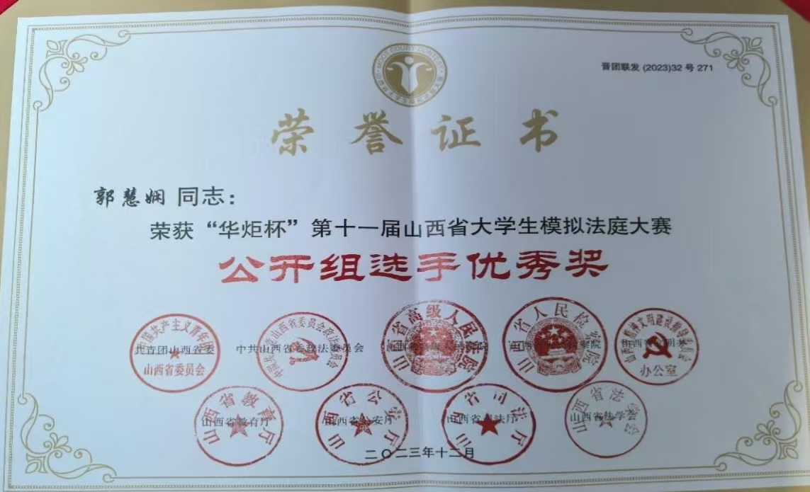 正是凭借这样的学习态度和方法,该生的专业成绩一直名列前茅,多门核心课程都取得了接近满分的优异成绩,学业成绩和综合成绩排名也始终稳定在全系第一。不仅如此,她还积极参加各类学科竞赛,比如在2024年第十四届“挑战杯”山西省大学生创业计划竞赛中,和团队成员一起精心准备,反复打磨方案,最终在比赛中荣获银奖。这次经历不仅检验了她运用专业知识能力,更提升了她与团队协作和解决实际问题的能力。她还参加了“山西省华炬杯模拟法庭大赛”,与小组成员共同努力,获得山西省优秀奖。