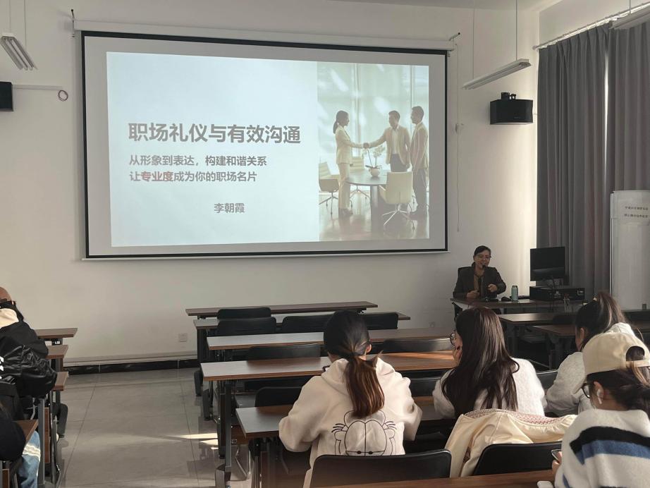 为帮助大学生提前洞悉职场规则,提升职业核心素养,为未来职场发展赋能,2025年10月30日,晋中职业技术学院经济管理系特邀我部李朝霞主任开展“职场礼仪与有效沟通”专题讲座 。