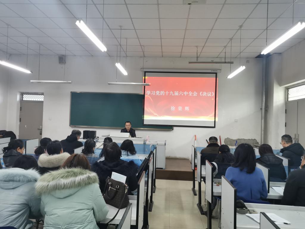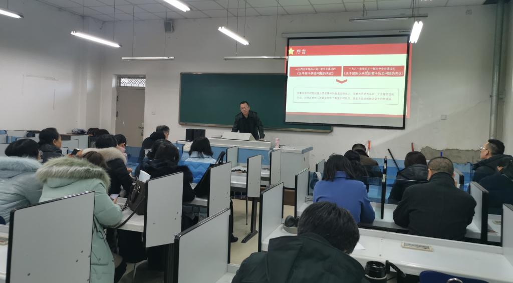 2021年12月6日下午,基础部全体教师在语音三室集体倾听了基础部党支部书记、部主任徐荣辉对党的十九届六中全会《决议》进行的学习宣讲。