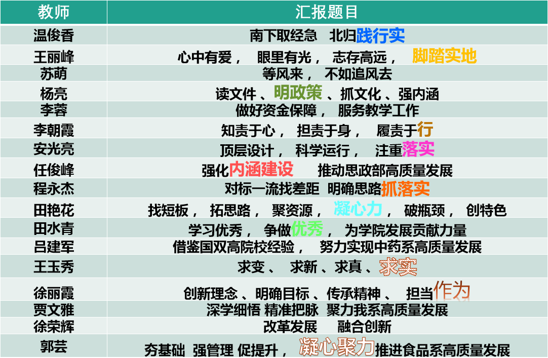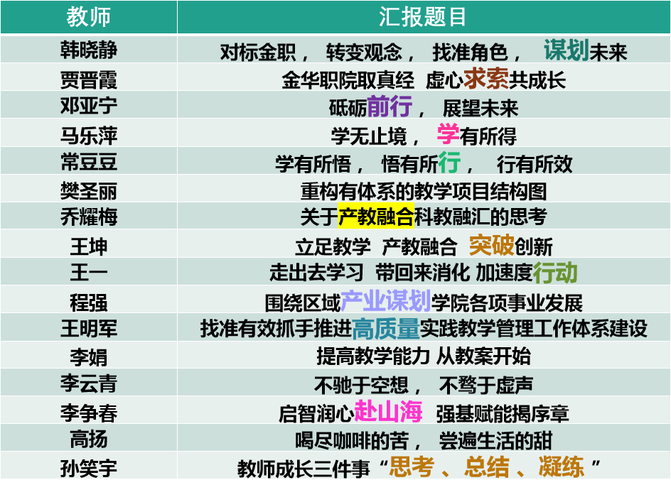 交流会上,50位参训教师结合金华职院学习的所听、所感和所获,联系工作实际,分享了金华职院“抬头看路,志存高远”的办学理念,“服务当地,产教融合”的办学思路,“环境育人、润物无声”的校园文化,使与会人员进一步领略了金职人“深耕职教、追光前行”的责任担当,“提振专业、潜心诣学”的治学风范和“干在实处、久久为功”的务实作风。