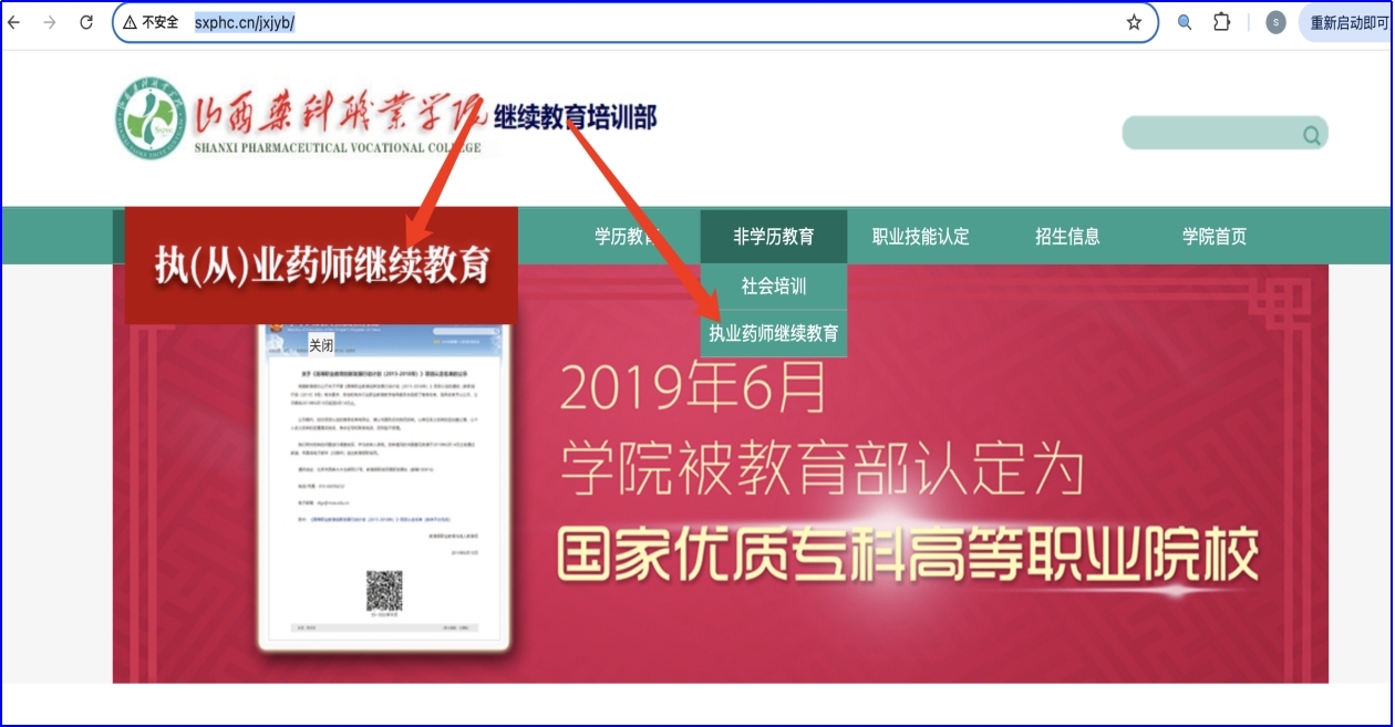 方法一:登录“山西省执业药师继续教育管理平台”(https://www.cnslpa.com/login)→登录或新用户注册→点击“继续教育报名”→选择山西药科职业学院报名,完成学习。