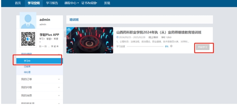 (十)购买成功后会在学习空间中出现此培训班点击右下继续学习按钮。