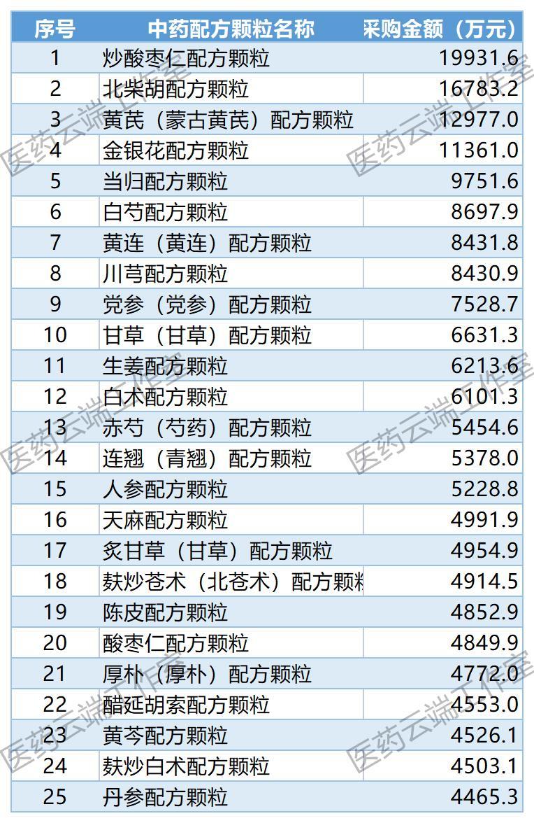 按最高有效申报价及采购需求量测算,此次集采的200个品种总采购规模为37.15亿元。其中,炒酸枣仁、北柴胡、黄芪(蒙古黄芪)、金银花等4个产品采购规模过亿元。以下是采购金额超过4000万元的配方颗粒,共有22个品种。